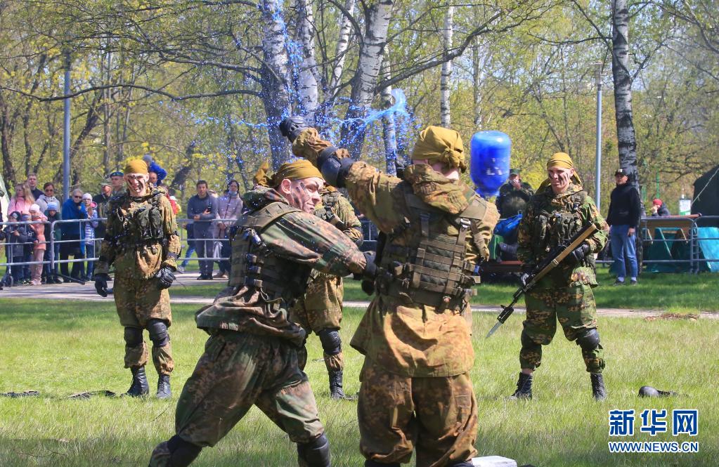 5月9日,軍人在白俄羅斯首都明斯克進行勝利日節(jié)慶格斗表演。