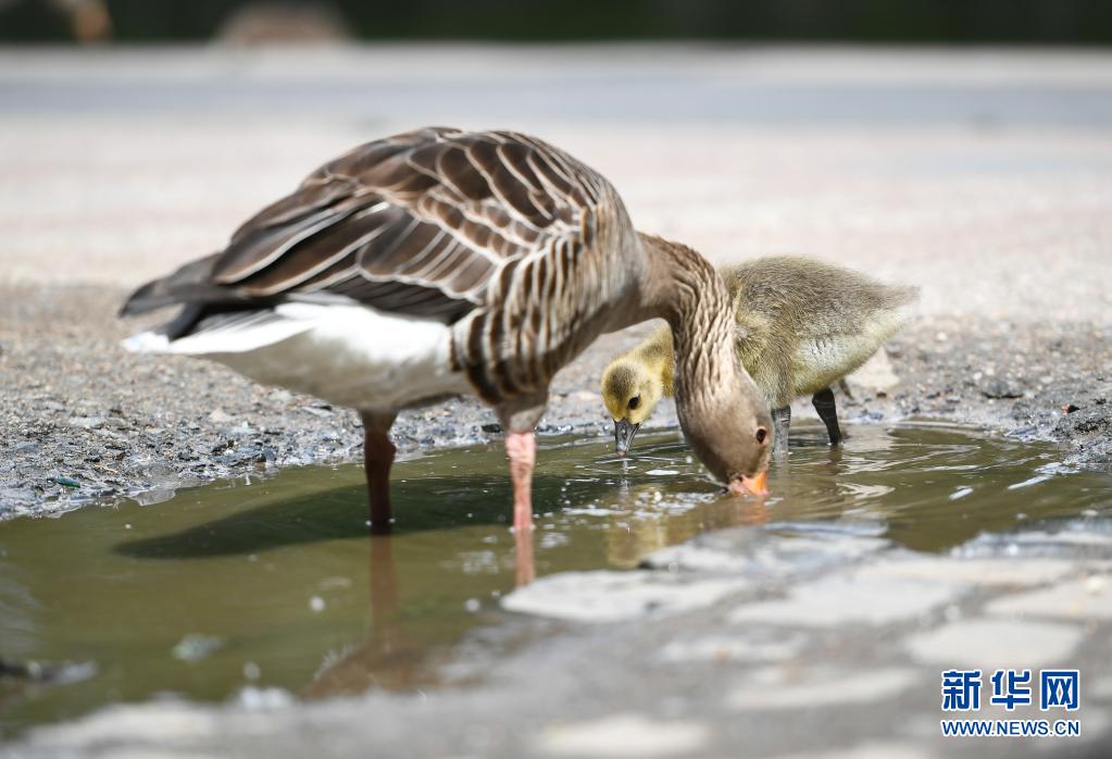 5月19日,兩只灰雁在德國(guó)法蘭克福的美茵河畔飲水。