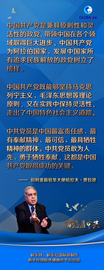 新華社大馬士革6月3日電(記者汪健 鄭一晗)敘利亞前駐華大使哈拉夫·賈拉德日前在大馬士革接受新華社記者專訪時(shí)說(shuō),中國(guó)共產(chǎn)黨是兼具原則性和靈活性的政黨,帶領(lǐng)中國(guó)在各個(gè)領(lǐng)域取得巨大進(jìn)步,“中國(guó)共產(chǎn)黨為阿拉伯國(guó)家、發(fā)展中國(guó)家所有追求民族解放的政黨樹(shù)立了榜樣”。