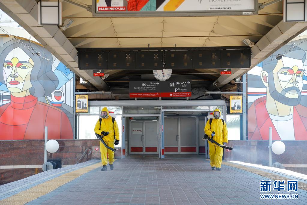 6月24日,工作人員身著防護(hù)服在俄羅斯莫斯科一個(gè)火車站進(jìn)行消毒作業(yè)。