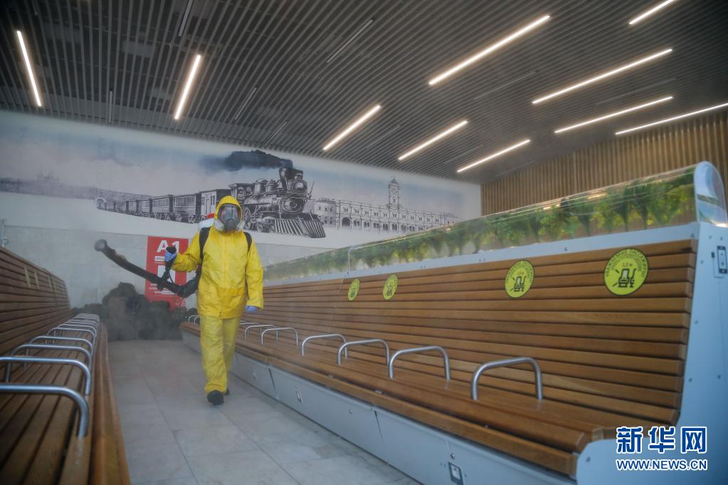 6月24日,工作人員身著防護(hù)服在俄羅斯莫斯科一個(gè)火車站進(jìn)行消毒作業(yè)。